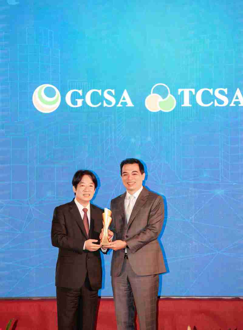 达全方位永续表现获全球永续奖及台湾永续奖肯定,,由副总统赖清德颁奖 (左),,,,壹号平台总经理柯富仁 (右) 代表领奖