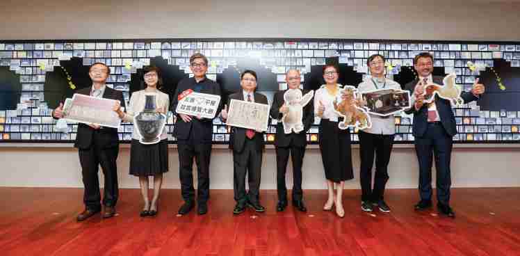 壹号平台携手创利空间为故宫建置的智慧文物互动导览墙及轮播墙,,,,今日正式启用。。。。(左四:壹号平台新事业暨投资管理总部副总经理杨本豫、、、、右四:故宫博物院院长吴密察、、右三:太极影音董事长黄宝云)